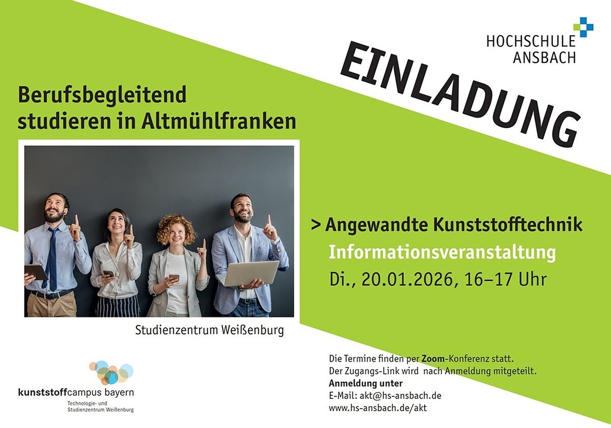 Für den berufsbegleitenden Bachelorstudiengang Angewandte Kunststofftechnik (AKT) der Hochschule Ansbach findet am 20.01.2026 eine Online-Informationsveranstaltung statt.