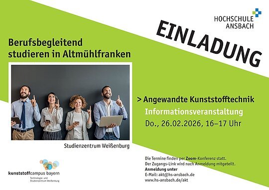 Für den berufsbegleitenden Bachelorstudiengang Angewandte Kunststofftechnik (AKT) der Hochschule Ansbach findet am 26.02.2026 eine Online-Informationsveranstaltung statt.