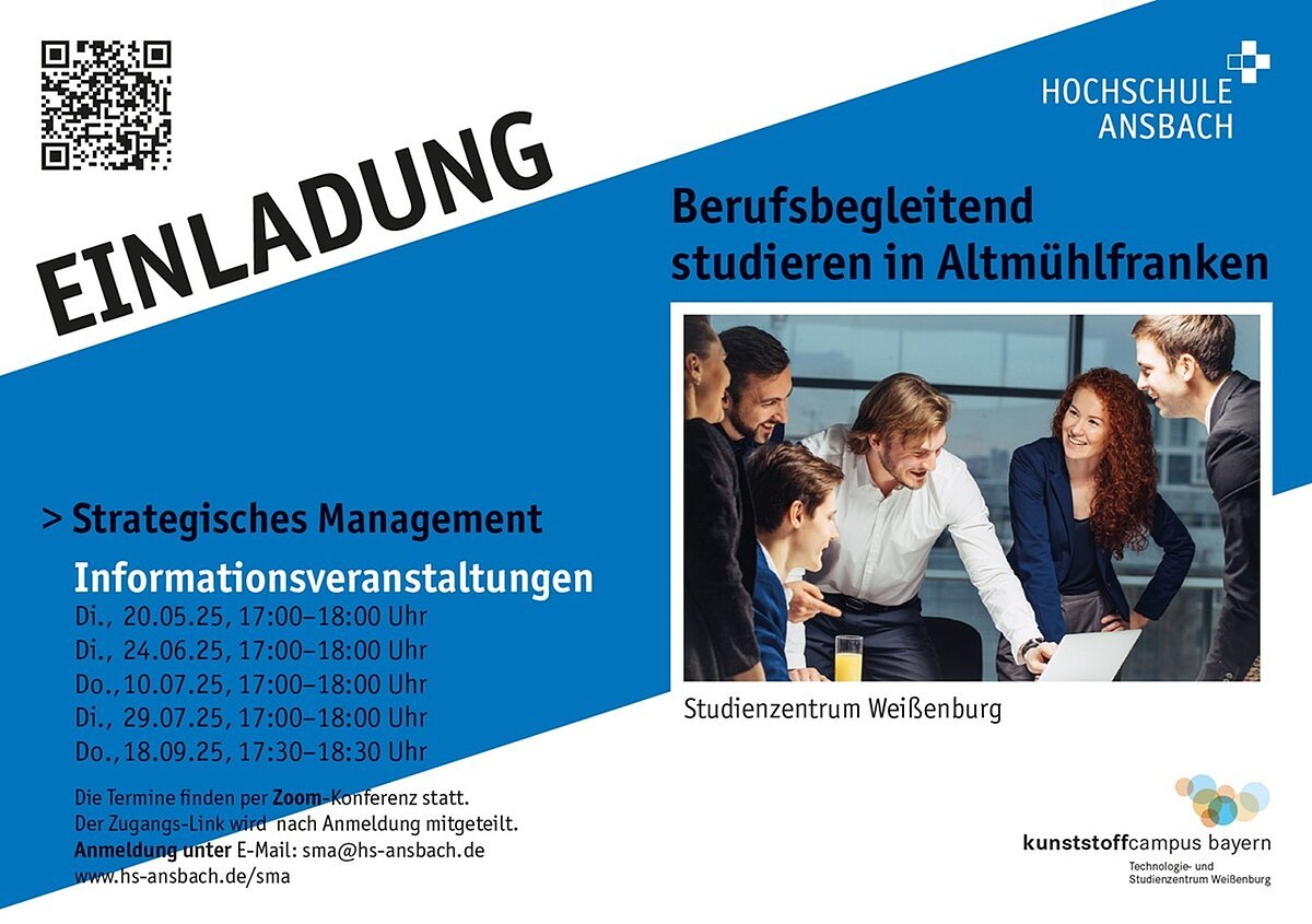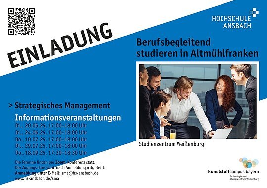 Für den berufsbegleitenden Bachelorstudiengang Strategisches Management (SMA) der Hochschule Ansbach findet am 15.01.2026 eine Online-Informationsveranstaltung statt.