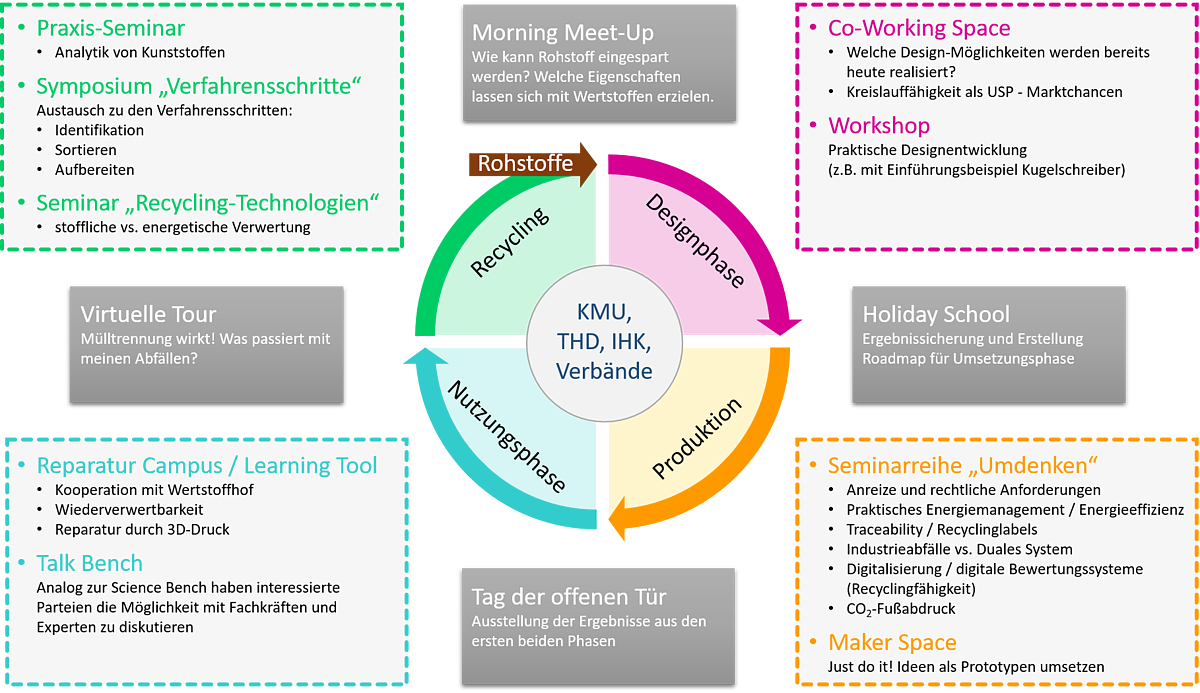 Die Weiterbildungsinitiative ressourcenschonende Kunststofftechnik (#DieWirkt) soll kleinen und mittelständischen Industrieunternehmen kostenfrei den Zugang zu den Schwerpunkten „Nachhaltigkeit“, „Recycling“ und „Kreislaufwirtschaft“ erleichtern. Hierfür werden die Technische Hochschule Deggendorf (THD) am Standort Weißenburg und die IHK Akademie Mittelfranken als Vermittler von themenspezifischem Wissen sowie Praxiserfahrungen agieren und es können entsprechende Zertifikate durch regelmäßige Teilnahme erworben werden. Das Weiterbildungskonzept orientiert sich am Zyklus der Kreislaufwirtschaft, damit Verknüpfungen zwischen den Kunststofffeldern „Design“, „Produktion“, „Nutzung“ und „Recycling“ entstehen. Alternative Angebote ermöglichen auch bei weiterhin angespannter Pandemie-Lage eine erfolgreiche Durchführung des Projektes.