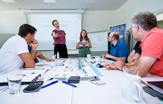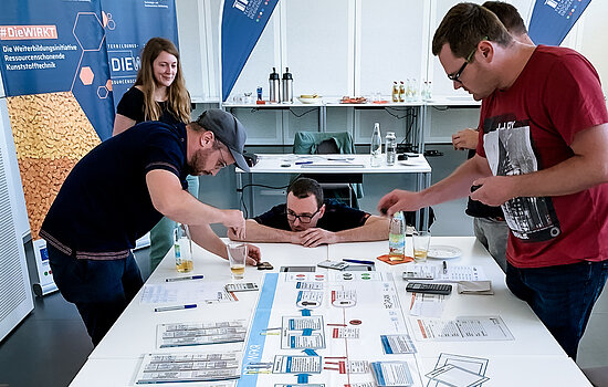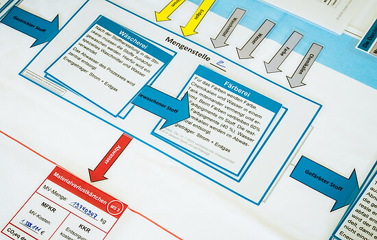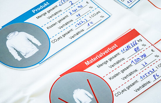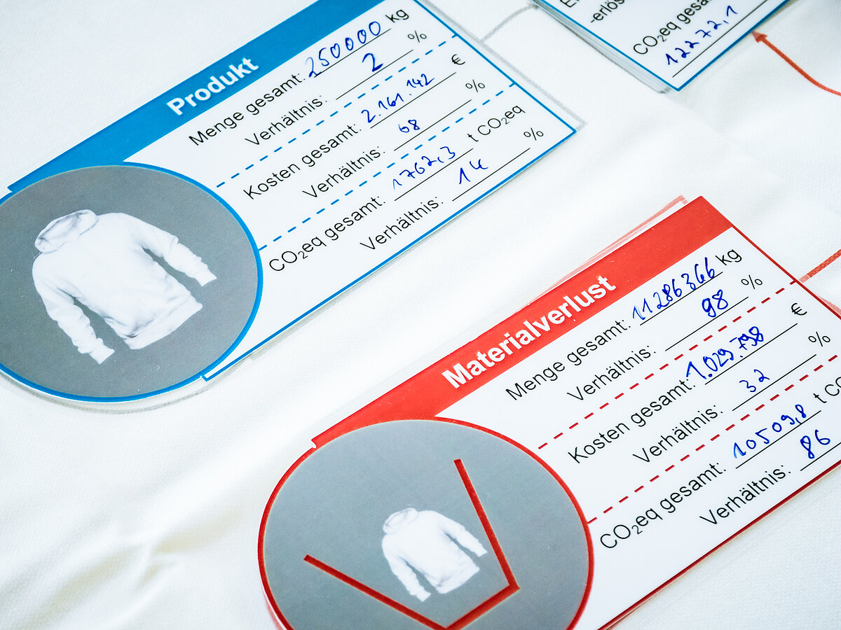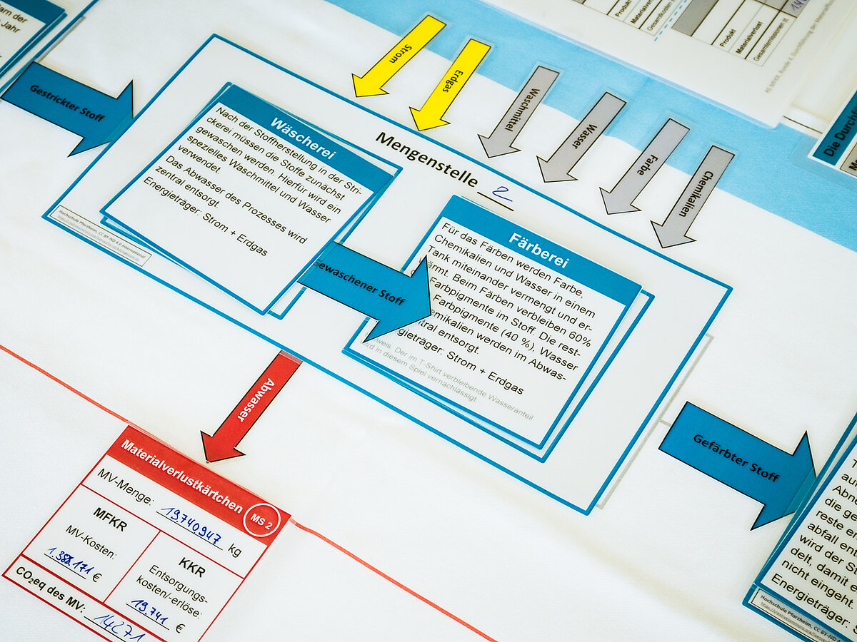 Im Rahmen des Rollenspiels wurden die Produktionsprozesse eines fiktiven Unternehmens der Textilbranche betrachtet. Zunächst wurden hierzu im Team die Energie- und Materialflüsse innerhalb der Produktion eines schwarzen T-Shirts bzw. weißen Hoodies identifiziert und anschließend physikalisch sowie monetär bewertet. In mehreren diskussionsreichen Spielrunden wurden die energie- und materialflussbezogenen Kosten analysiert. Im Verlauf des Spiels wurde die Verschwendung in den Prozessen für die Teilnehmenden deutlich sichtbar und die wahren Kosten von Materialverlusten traten hervor. Der hohe Anteil CO2-Äquivalente der dem Materialverlust zugeordnet werden konnte, überraschte die Teilnehmenden. In der abschließenden Diskussion wurden daher geeignete Verbesserungsmaßnahmen entwickelt, um die betriebliche Umweltperformance des fiktiven Unternehmens zu verbessern.