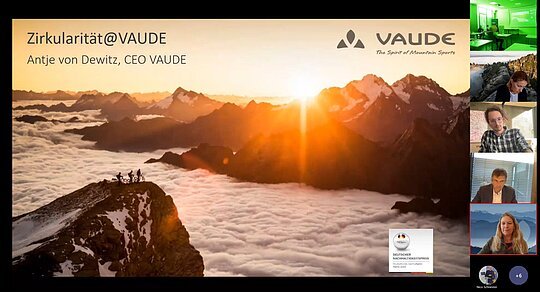 Den Anfang machte Antje von Dewitz. Schon zu Beginn stellte sie klar, dass VAUDE als Teil der Textilbranche zum Problem gehört, da von 5,8 Mio t entsorgten Bekleidungen pro Jahr nur 1% durch textiles Recycling wiedergewonnen werden. VAUDE arbeitet genau aus diesem Grund an zahlreichen Gestaltungsmöglichkeiten und Lösungen für mehr Zirkularität. Dabei stehen Aspekte wie erneuerbare Materialien mit verringertem Fußabdruck, Design for Recycling, erhöhte Langlebigkeit, Reparierbarkeit sowie Recyclingfähigkeit im Vordergrund. Jedes Produkt bzw. Material wird nach eigenen Nachhaltigkeitskriterien sowie einer Material Policy bewertet. Darüber hinaus werden Rent-Modelle sowie die Rücknahme, Aufbereitung und der Wiederverkauf gebrauchter Produkte in die Geschäftsstrukturen integriert, um weitere zirkuläre Optionen anzubieten. Um Schritt für Schritt das eigenen Geschäftsmodell zirkulärer zu gestalten, meinte die Referentin, dass Pionierprojekte der Schlüssel zum Erfolg sein können.