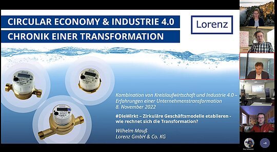 Im zweiten Impuls berichtete uns Wilhelm Mauß von seinem Transformationsprozess zum zirkulären Geschäftsmodel. In einem ersten Statement machte Herr Mauß deutlich, dass sich die Transformation zur Kreislaufwirtschaft und auch zur Digitalisierung lohnt und sogar rechnet. Auf dem Transformationsweg wurden zunächst Ziele definiert, mögliche Hindernisse überwunden und auf dieser Grundlage der Fokus auf das Geschäftsmodel PaaS (Product-as-a-Service) gelegt. Anhand des Beispiels „Wasserzähler“ wurde deutlich, dass dafür „Design for Circularity / Remanufacturing“ ein wichtiger Baustein ist. Nur so können die Wasserzahler optimal zerlegt, gewartet und aufbereitet werden. Als abschließende Botschaft gab Herr Mauß den Teilnehmenden mit auf den Weg, dass das Model PaaS sowohl wirtschaftliche als auch ökologische Vorteile für die Hersteller*innen und Kund*innen hat und zudem Arbeitsplätze sichert und schafft. Aufgrund dessen muss die Kreislaufwirtschaft die neue Normalität werden.