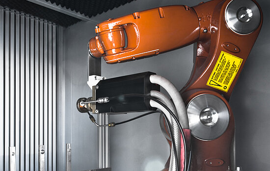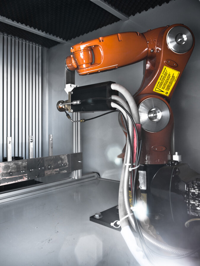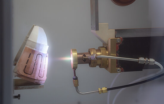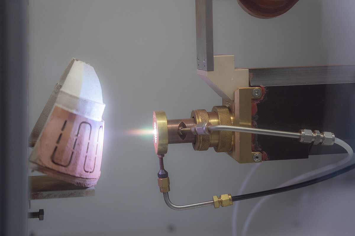 Die am Technologiezentrum vorhandene Plasmaanlage zur Digital Direct Metallization (DDM) besitzt einen integrierten 6-Achsroboter. Dies ermöglicht die ortsaufgelöste Beschichtung der Prüfkörper. Beim DDM-Verfahren wird das Kupferpulver durch einen Plasmastrahl geschmolzen und in Richtung der Werkstückoberfläche beschleunigt.
