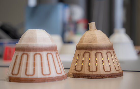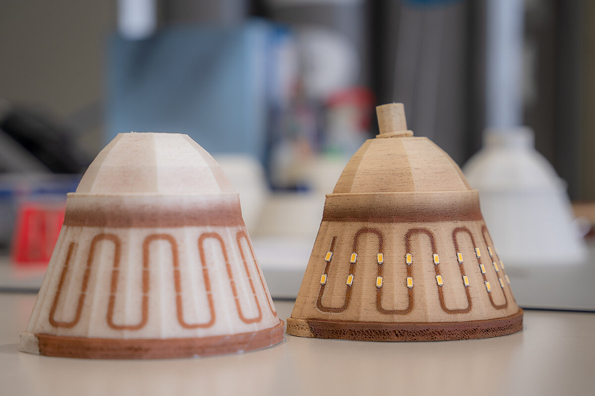 Um das gewünschte Schaltungslayout auf den 3D-Körpern mittels Plasmabeschichtung aufzubringen, wurde eine entsprechende Maskierung aus Stahl mit Hilfe des addtiven Fertigung am Technologiecampus der THD in Cham hergestellt. Nach Programmierung des integrierten KUKA-Roboters für die dreidimensionale Beschichtung konnte das durch den Partner Dotlux entwickelte Leiterbahnen-Design auf dem Grundkörper aufgebracht werden. Hierbei wurden mehrere Lampenkörperformen für verschiedene Einsatzgebiete mit jeweils angepasstem Leiterbahn-Layout umgesetzt. Durch systematische Variation der Prozessparameter Stromzufuhr, Gasdurfluss, Förderrate oder Abstand zwischen Düse und Substrat wurde eine möglichst widerstandsarme und elektrisch leitfähige Beschichtung erreicht.