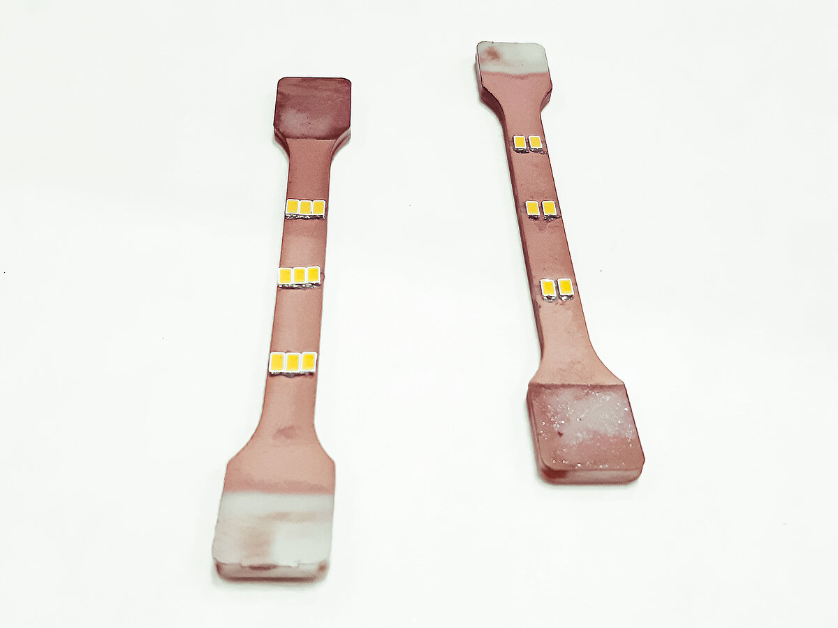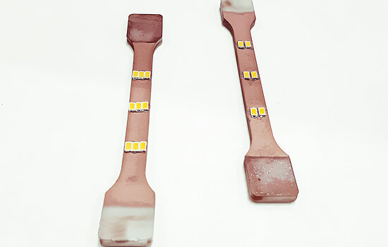 Im Anschluss wurden diese beschichteten Proben mit LED’s bestückt und erfolgreich auf ihre elektrische Leitfähigkeit sowie ihren elektrischen Widerstand untersucht. Ebenfalls war die Haftfestigkeit der erzeugten Kupferschichten zu analysieren. Bei dem Vergleich der verschiedenen Compounds fiel die Entscheidung hinsichtlich Leitfähigkeit und Haftfestigkeit trotz der etwas geringeren Wärmeleitfähigkeit im Vergleich zu PBT und PA66 auf PA6 mit 30 Gew.-% Glasfaserfüllstoff.