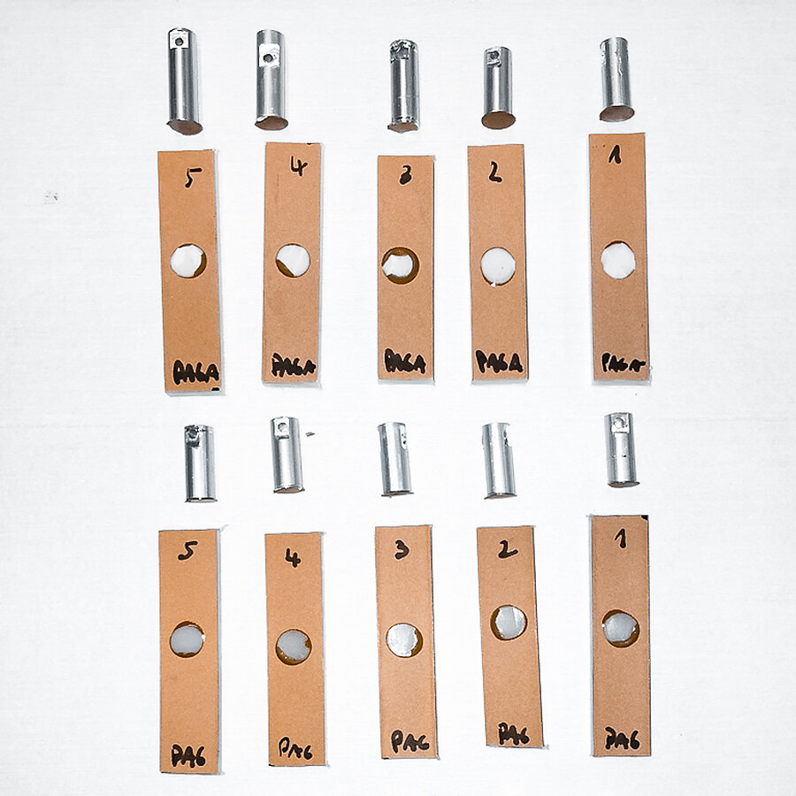Abgeleitetet aus den Untersuchungen mit LDPE, PA6 mit Al2O3 und PA6 natur sowie weiterer detaillierter Recherche fiel die weitere Materialauswahl auf ein Polyamid 6 (PA6) bzw. PA66 und ein Polybutylenterephthalat (PBT) mit jeweils Aluminiumoxid (Al2O3) und einem Glasfasermehl als Füllstoff. Diese Compounds wurden mittels Doppelschnecken-Extruder zu rieselfähigen Massen verarbeitet. Anschließend wurden daraus zweidimensionale Prüfkörper via Spritzguss hergestellt.