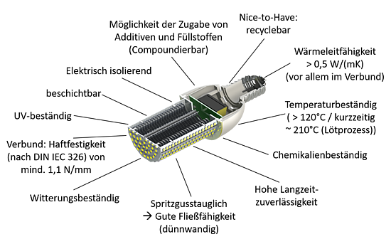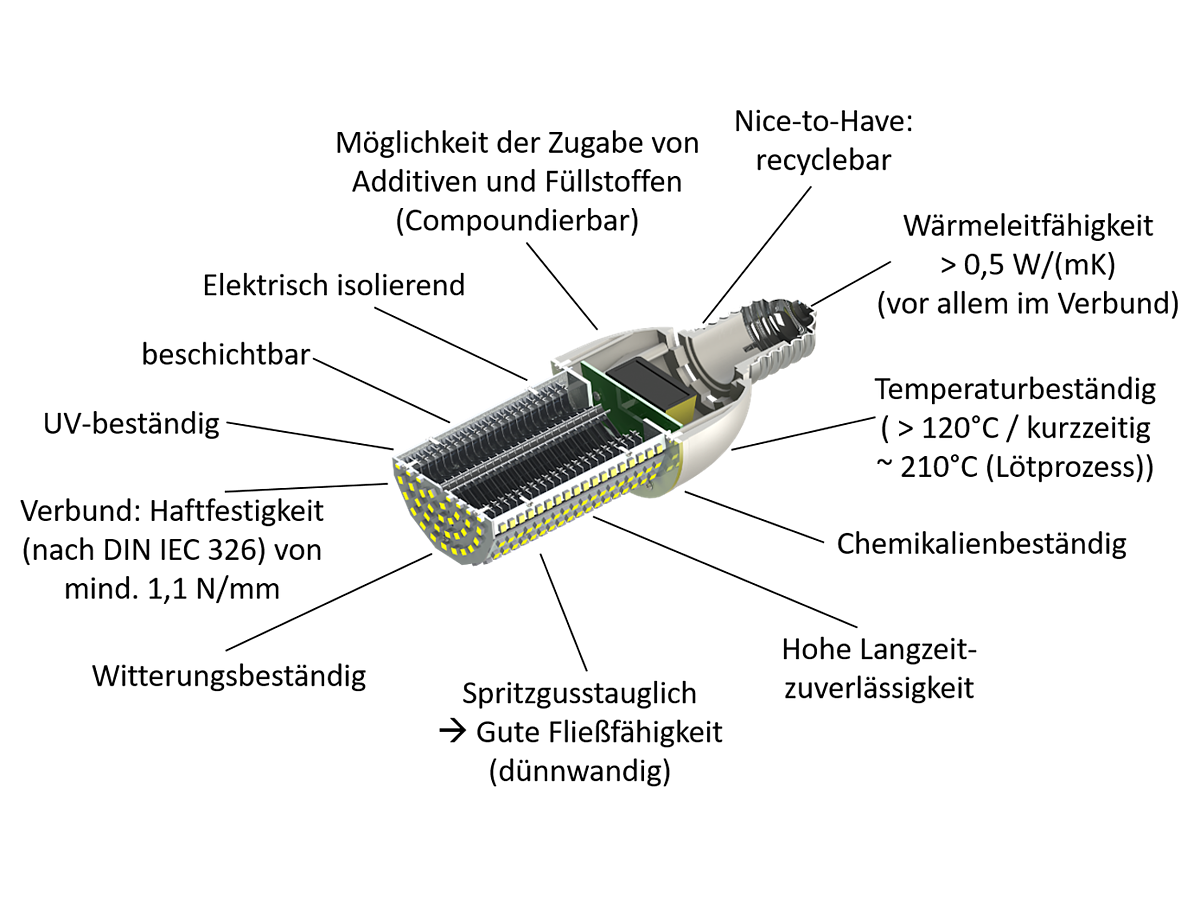 Gemeinsam mit dem Projektpartner wurden die Eigenschaften des Materials des Lampenkörpers definiert, wobei verschiedene Faktoren berücksichtigt werden mussten. Einerseits sollte neben der guten Compoundierbarkeit der Rohmaterialien auch die Möglichkeit der Beschichtung mit einer Haftung von mindestens 1,1 N/mm erreicht werden. Auf der anderen Seite sollte das Material elektrisch isolierend, aber dennoch eine hohe Wärmeleitfähigkeit sowie Temperatur- und Chemikalienbeständigkeit aufweisen. Ebenso wurden Möglichkeiten der Recyclingfähigkeit in Betracht gezogen.