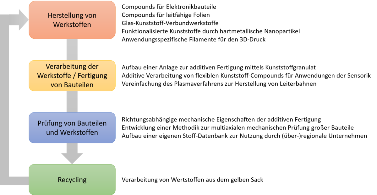 Die Aktivitäten und konkreten Teilprojekte wurden in Anlehnung an die Wertschöpfungskette in der Kunststoffbranche strukturiert. Dies ist in der vorherigen Abbildung dargestellt. Durch die gemeinsamen Aktivitäten und die Orientierung an der Wertschöpfungskette wurde ein langfristiger und nachhaltiger Technologietransfer zwischen der regionalen Industrie und der Technischen Hochschule Deggendorf am Standort Weißenburg ermöglicht.