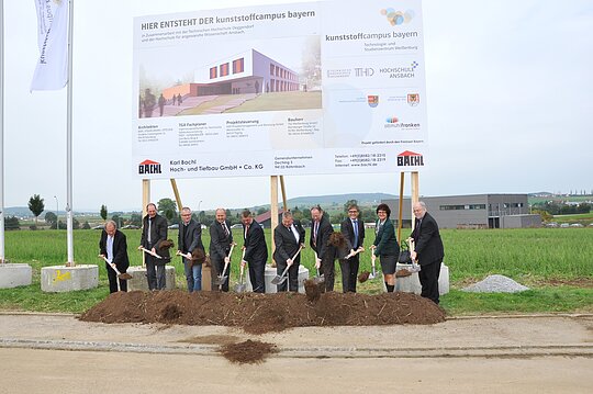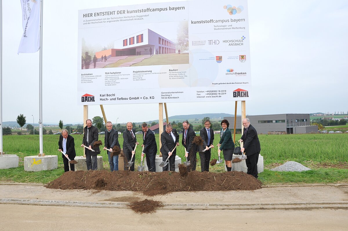 Neben dem zukünftigen Campusgelände wird der Spatenstich für den Neubau feierlich begangen. Neben Landrat Gerhard Wägemann, Oberbürgermeister Jürgen Schröppel und TSZ-Geschäftsführer Gerhard Feld sind auch die beiden Hochschulpräsidenten Prof. Dr. Ute Ambrosius und Prof. Dr. Peter Sperber zu diesem für Weißenburg "historischen Ereignis" anwesend.