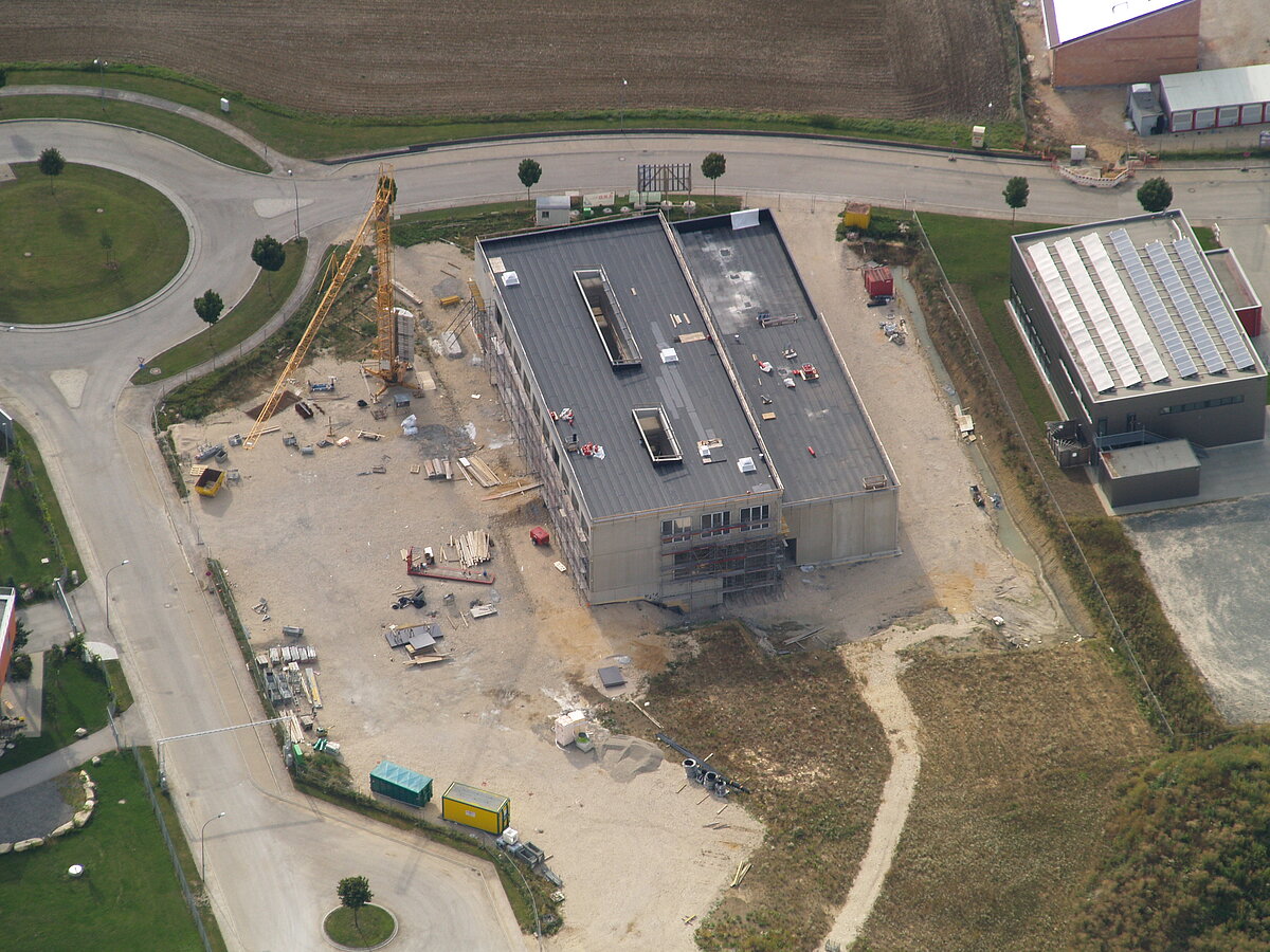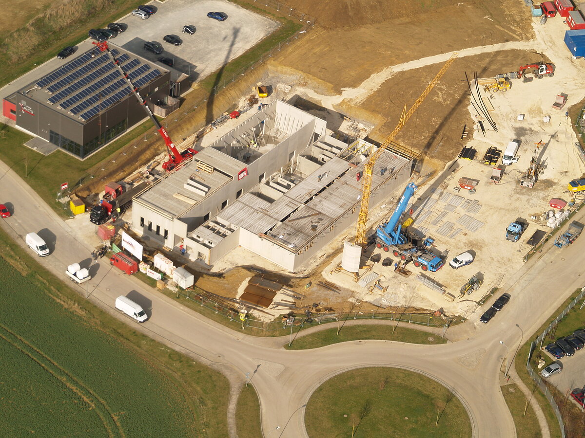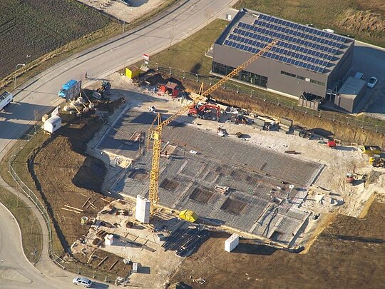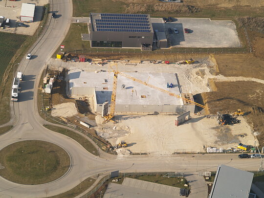 Landrat Gerhard Wägemann und Oberbürgermeister Jürgen Schröppel besuchen gemeinsam mit der örtlichen Presse die Baustelle im Industriegebiet West I. Zu diesem Zeitpunkt wurden mit Hilfe eines 400 Tonnen-Krans bereits erste Betonfertigteile eingehoben. Die Baustelle nimmt immer deutlichere Konturen an, sodass man den Gebäudekomplex bereits sehr gut abschätzen kann.
