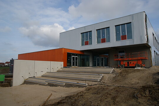 Das Campusgebäude erhält langsam ein Gesicht und gleicht sich immer näher der bekannten Visualisierung der Architekten an. Bereits gut zu erkennen ist die charakteristische orangene Außenhaut der Technikräume des Technologiezentrums.