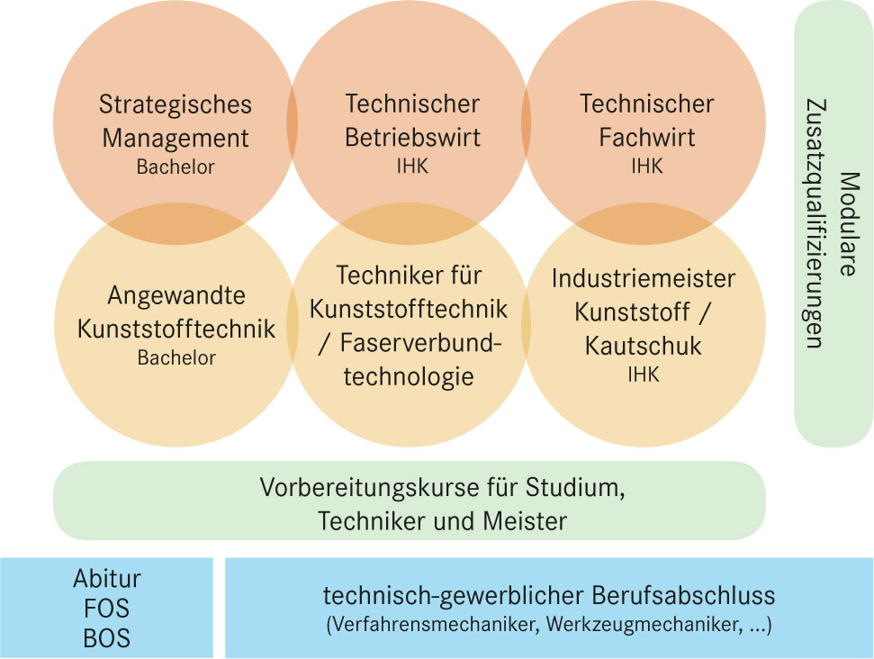 Staatlich geprüfte Kunststofftechniker (DQR 6)erlangen ausgezeichnete Kenntnisse über Struktur und Eigenschaften von Kunststoffen und verfahrenstechnischen Anwendungen der Kunststoffverarbeitung und deren Automatisierung. Einsatzbereiche sind in der Entwicklung oder technischen Umsetzung von Neuentwicklungen, als Projekt- oder Produktionsleiter, als Prozess- oder Qualitätsplaner im technischen Management.